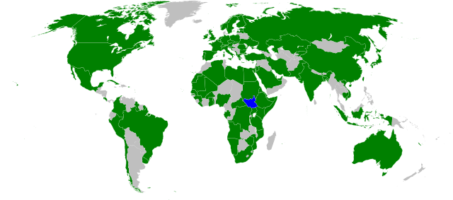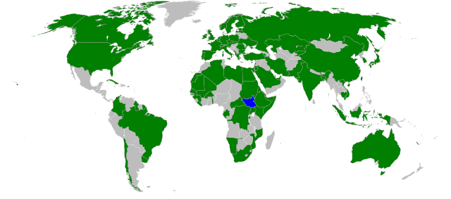 | Countries which have recognized South Sudan’s sovereignty (green). South Sudan in blue. Modified from this Wikimedia map (public domain). |